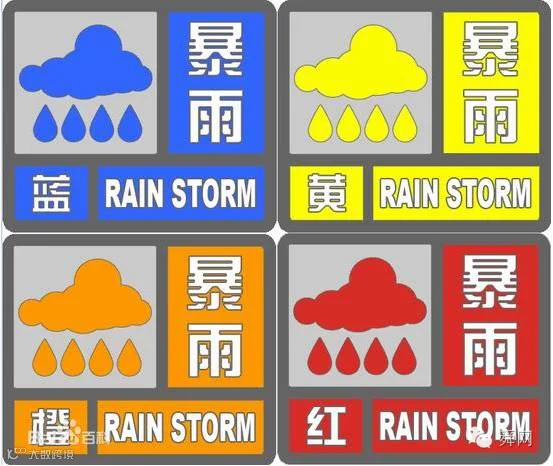 暴雨预警信号分四级,分别以蓝色、黄色、橙色、红色表示。
