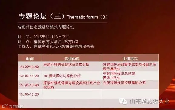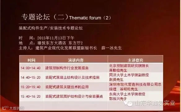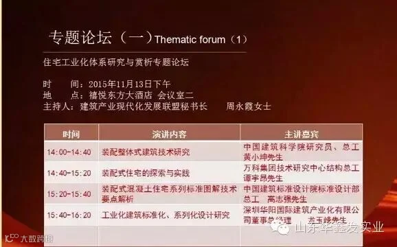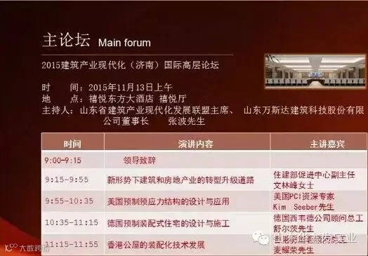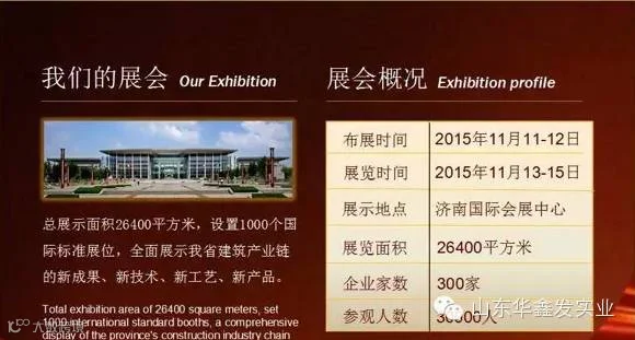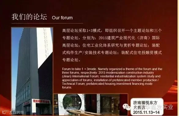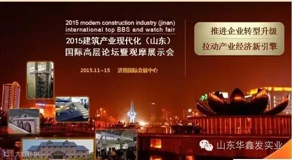 活动名称:2015建筑产业现代化(山东)国际高层论坛暨观摩展示会举办时间:2015年11月13-15日论坛地点:济南国际会展中心四楼多功能厅展览地点:济南国际会展中心(工业南路28号)论坛人数:800人(每场)展览规模:16000平方米,800个国际标准展位专业观众:20000人次
