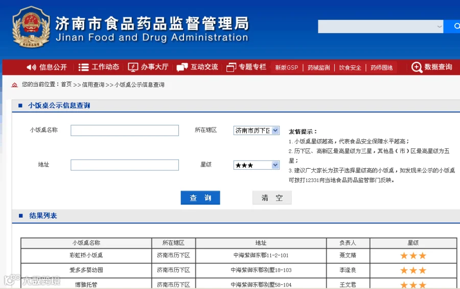 记者了解到,为方便学生家长更好更明白地选择小饭桌,济南市食药监局在其门户网站对全市小饭桌信息进行公示。广大学生家长可以登录www.jnfda.gov.cn 在网站首页中部右侧的“数据查询”一栏中进入“小饭桌公示”的子栏目查询。其中,小饭桌名称、所在辖区、地址、星级等均可进行查询。