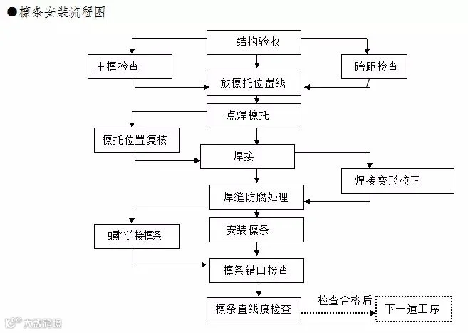 弹线:檩条支承点应按设计要求的支承点位置固定,所以支承点应用墨线弹出(或划出)中心位置,以供檩条安装定位,确保檩条的直线性和按檩条布置图布置。