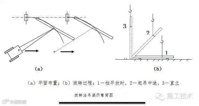 钢柱材料卸货时,根据钢柱构件编号按照施工图纸一一就位。构件就位后采用单机旋转法吊装,为提高吊装效率,在堆放柱时,尽量使柱的绑扎点、柱脚中心与基础中心三点共圆弧。