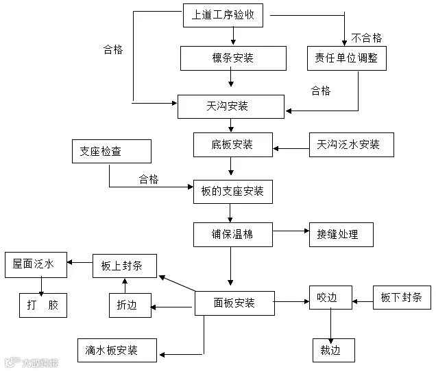根据金属屋面系统的构造和系统的安装程序,本工程的施工程序如下图所示: