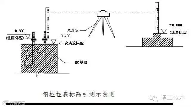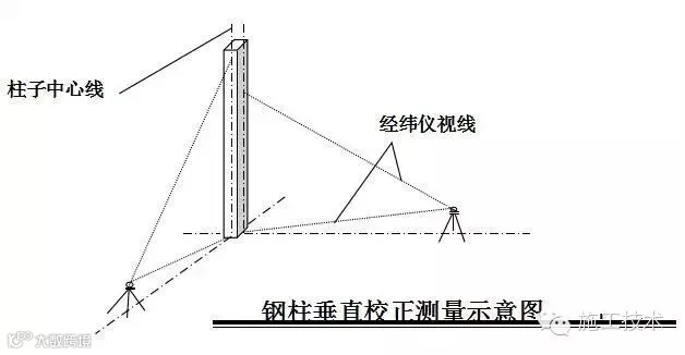 柱子的垂直校正,测量用两台经纬仪安置在纵横轴线上,先对准柱底垂直翼缘板或中线,再渐渐仰视到柱顶,如中线偏离视线,表示柱子不垂直,可指挥调节拉绳或支撑,可用敲打等方法使柱子垂直。在实际工作中,常把成排的柱子都竖起来,然后进行校正。这时可把两台经纬仪分别安置在纵横轴线一侧,偏离中线一般不得大于3mm。