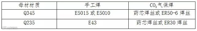 根据工程结构焊接接点位置,现场焊接施工采用手工焊相结合的焊接方法,焊接材料根据结构钢材的材质,现场焊接采用手工电弧焊,焊接材料为:E4303或E506焊条,定位焊用手工电弧焊进行。打底焊用直径3.2的焊条,填充及盖面焊用直径4.0的焊条进行。(如天气较湿,需进行电焊条烘烤)按表选择: