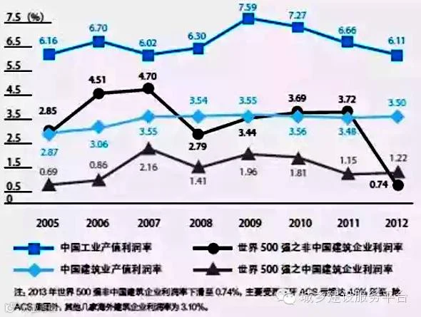 从图中可以看出,同行业内相比,中国特大型建筑企业赢利水平远低于国外大型建企,同时也远低于国内整个行业水平;与其他行业相比,中国建筑业远低于中国工业平均水平,应属第二产业中利润率最低的行业。