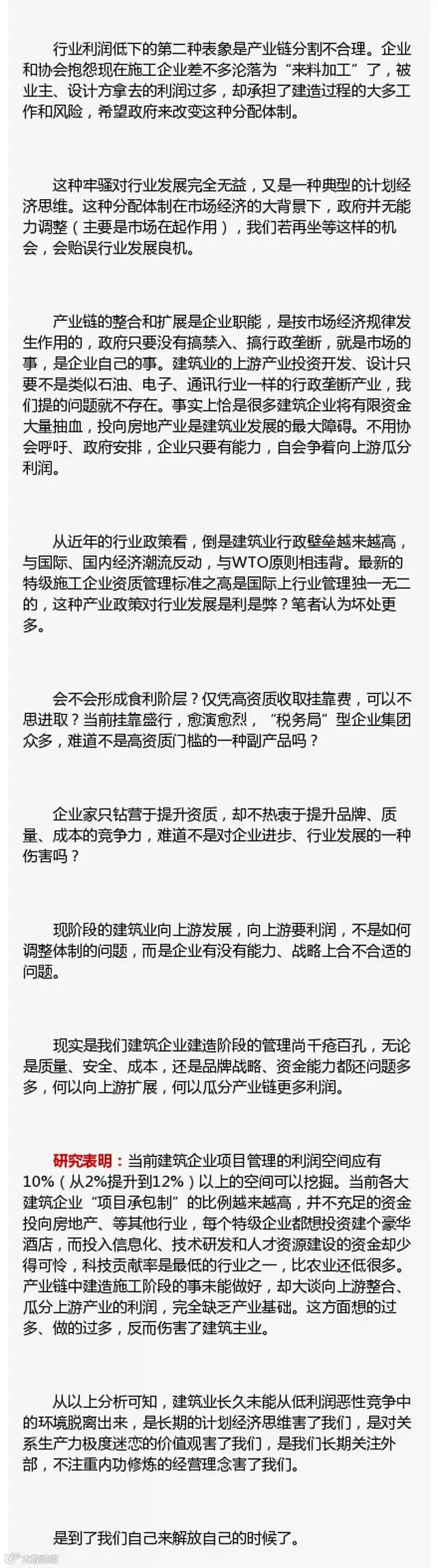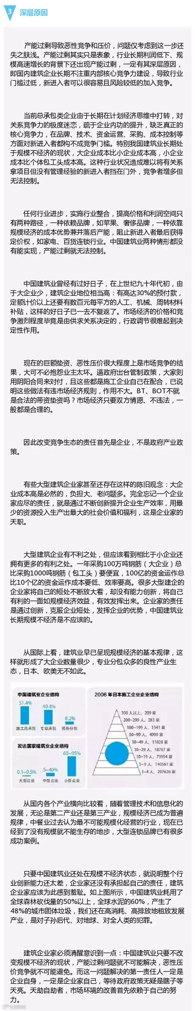 市场经济规律在建筑业究竟是如何发生作用的。行业领导、企业家穷于应付公关和各个出问题项目上的救火。整个行业缺乏真正的研究力量,让我们认清行业的本质和规律,采取有效措施。