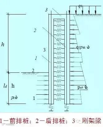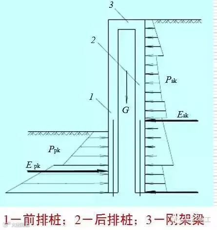 双排桩结构——由前、后两排支护桩和梁连接成的刚架及冠梁组成的支挡式结构。