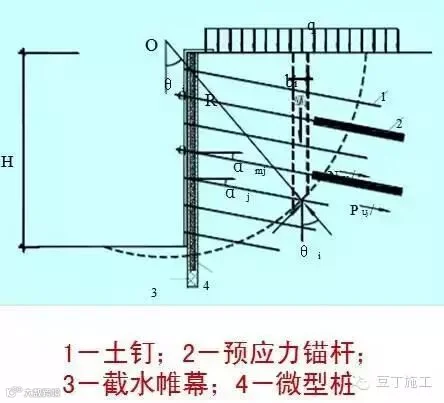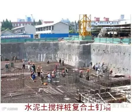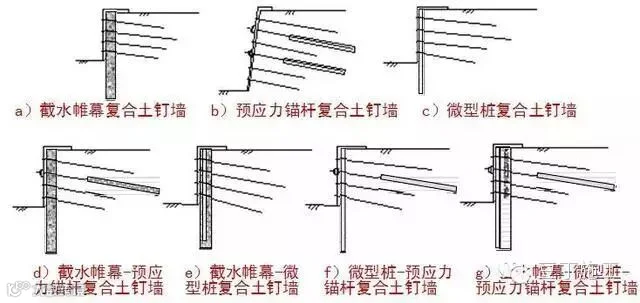复合土钉墙——采用水泥土搅拌桩、预应力锚杆、微型桩等的一类或几类结构与土钉墙复合而成的支护结构。