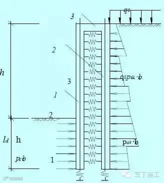 2)前、后排桩之间土体:考虑其的反力与变形关系(桩间土看作水平向单向压缩体,按压缩模量确定刚度系数)