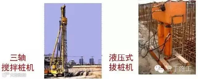 搅拌桩施工机械:三轴(四轴或五轴)搅拌桩机械;桩径650~1000mm,最大深度可达60m。