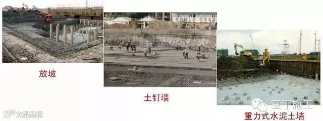 土体加固类——放坡、土钉墙、重力式水泥土墙等。