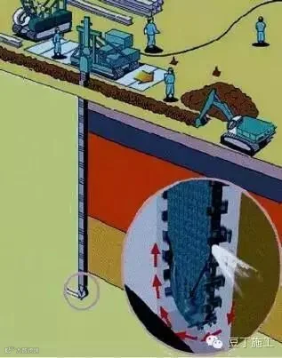 施工工艺——主机所带的链锯式搅拌刀具沉入地基土中并沿刀架移动,作往复运动,并在深度方向灌入水泥浆液,与土体搅拌、混合成墙。