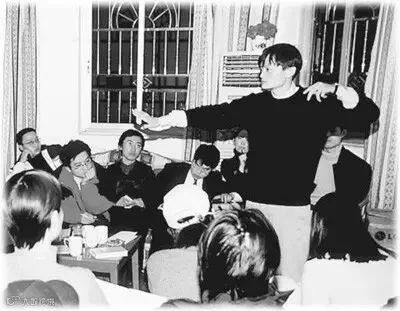 1999年秋天,18个年轻人凑了50万元在杭州西子湖畔谋划创业。瞧,这个演讲的年轻人就是马云。(资料图片)