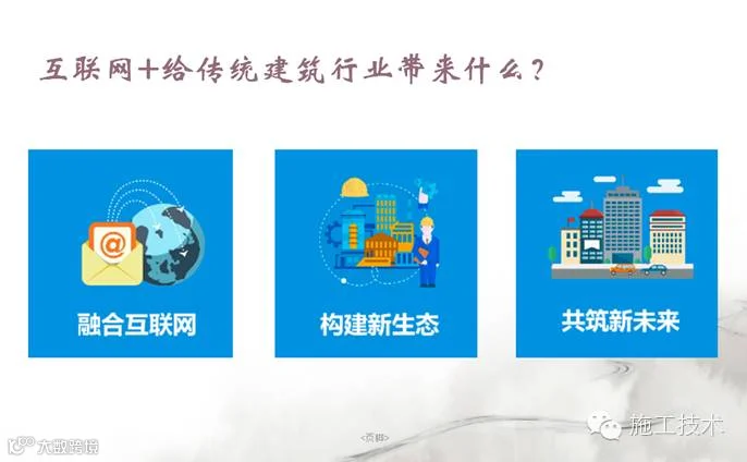 互联网+就是以互联化、集成化、数据化、智能化的信息化手段为有效支撑,通过技术创新与管理创新,带动企业与人员能力的提升,实现建造过程、运维过程、建筑及基础设施产品三方面的升级,最终重构建筑产业新生态。