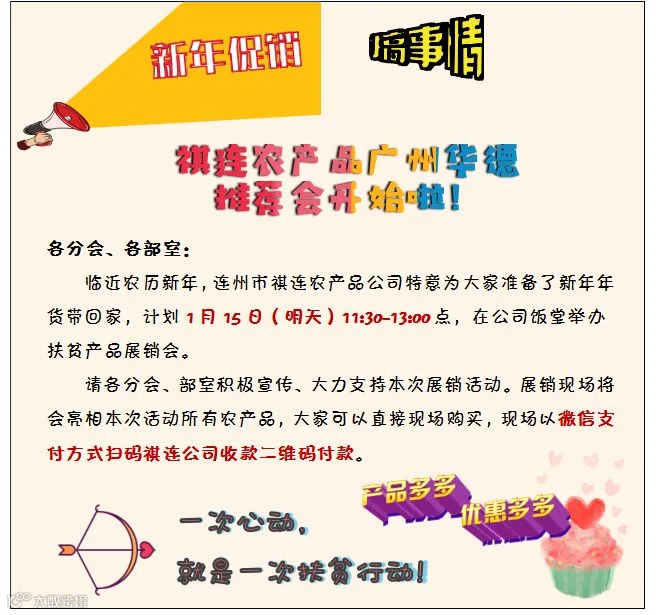 1月15日,广州华德以“一次心动,就是一次扶贫行动”为口号,在公司饭堂举办了一场简单而又隆重的祺连农产品推介会。推荐会前,公司党群部线上线下多渠道宣传,为推介会大卖助力。
