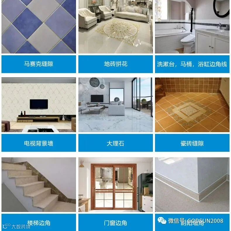 4、 适用范围广泛:瓷砖、马赛克、石材、木板、石膏板、铝塑板、玻璃等装饰材料的缝隙均可使用,无论是刚装修新铺装的瓷砖缝,还是已经使用多年的瓷砖缝都可使用;
