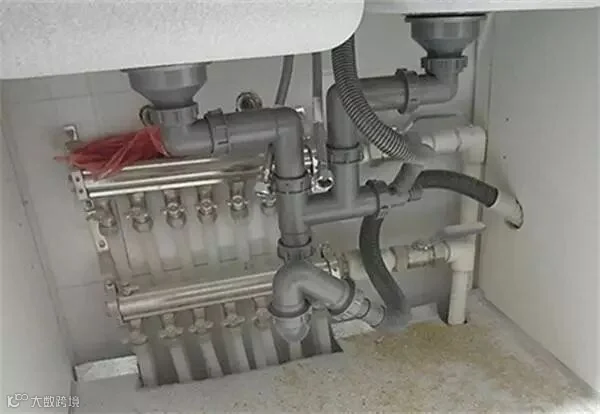 分水器一般设置在厨卫的台盆柜内,除了安置处的防水处理外,分出的地暖盘管在通过厨卫的门槛石下方时,需用水泥砂浆浇筑封死,并在内侧仔细的做防水处理,防止渗到客厅等处的地板之下。