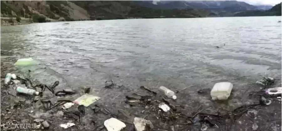 在漂浮着垃圾的西藏湖泊边,
