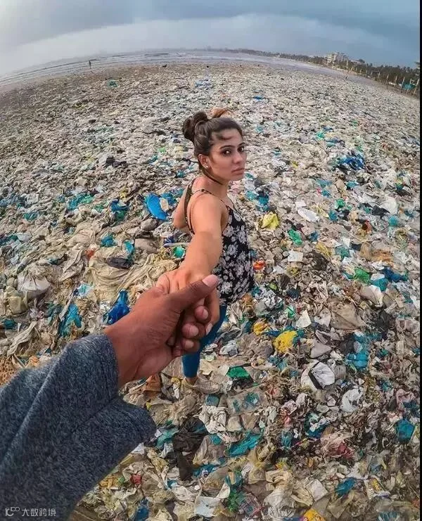 在一片垃圾的海洋里,摄影师拉着一位美丽女孩的手,拍下了她回头的一幕。这本是风靡网络的一组情侣拍照姿势,但在这张照片里,只看出茫然、无奈和可怕。