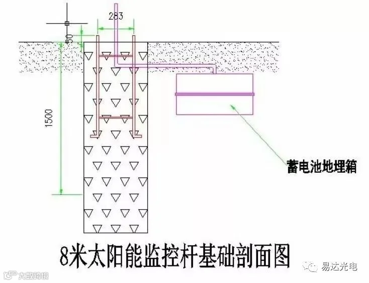 地基是用来固定太阳能监控杆的结构,同时它也起到放置和保护蓄电池的作用。