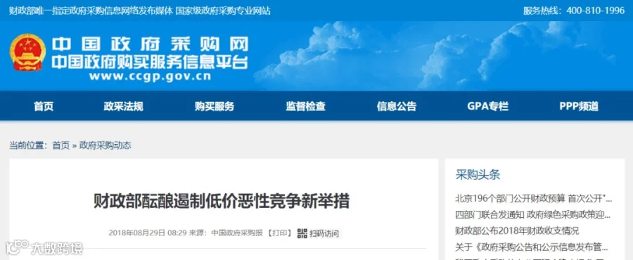 近日,中国政府采购网发布最新通告《财政部酝酿遏制低价恶性竞争新举措》。