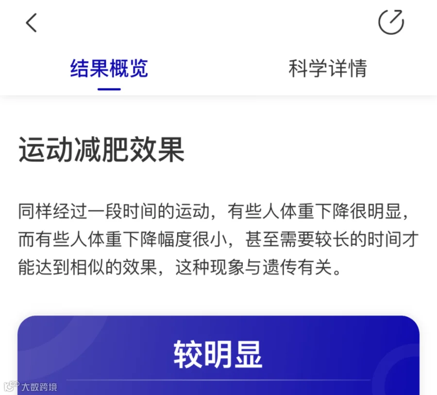居家采样,5分钟搞定,不用抽血,不用跑机构。样本寄出后,坐等app推送你的基因报告,所有减肥相关基因一目了然,可视化呈现,随时可查。更重要的是,报告不止给数据,更给答案,还会根据你的基因型,生成1v1减重指南:
