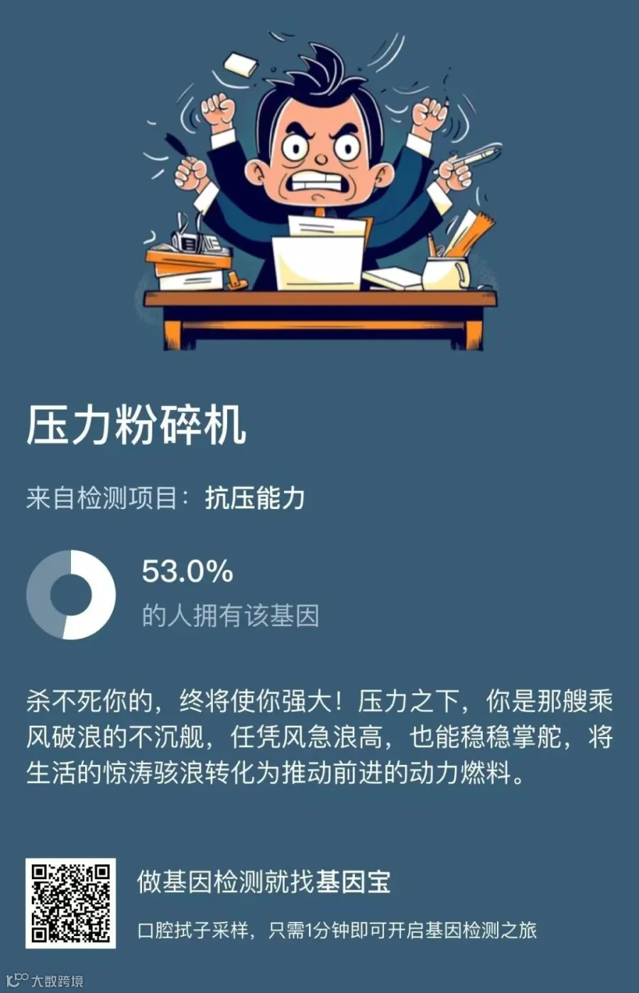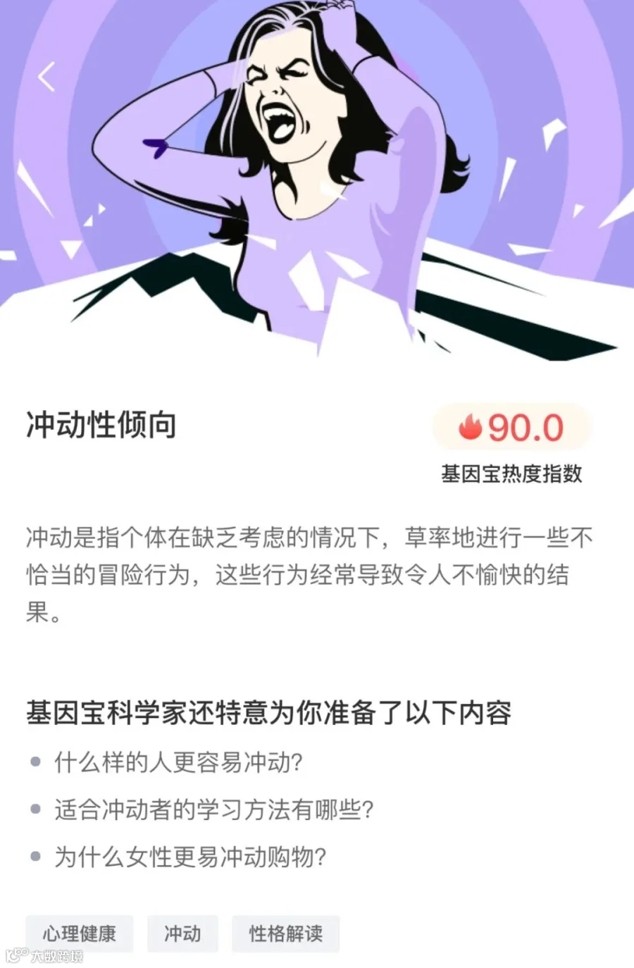很多心理特质都与基因密切相关,想了解自己的性格特质和心理健康,可以体验一下基因宝发现版套餐。