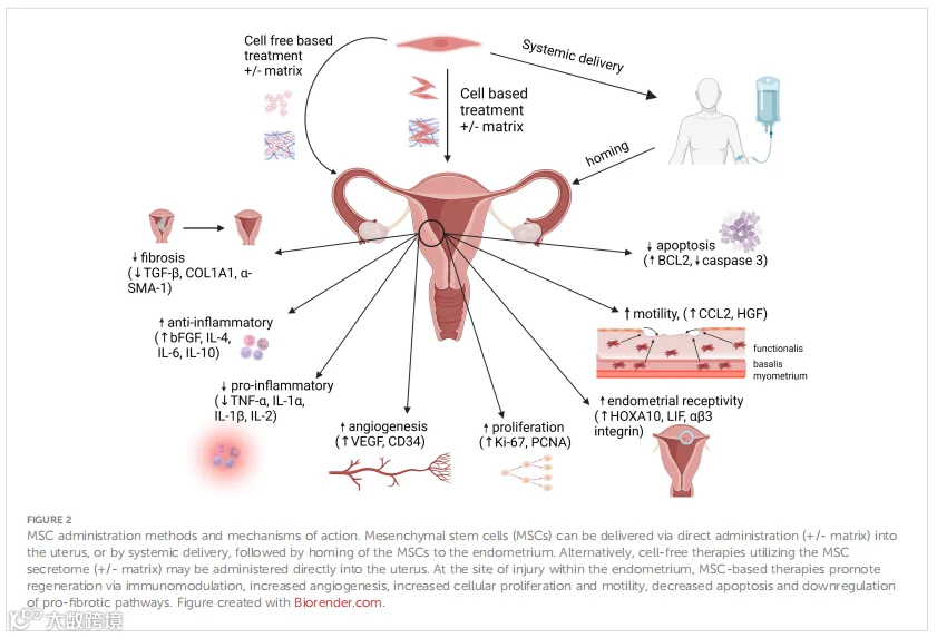 另外,利用MSC分泌组的无细胞疗法可直接给药到子宫内。MSC在子宫内膜内的损伤部位通过免疫调节、增加血管生成、增加细胞增殖和运动性、减少细胞凋亡和下调促纤维化途径来促进再生。