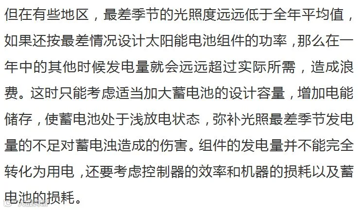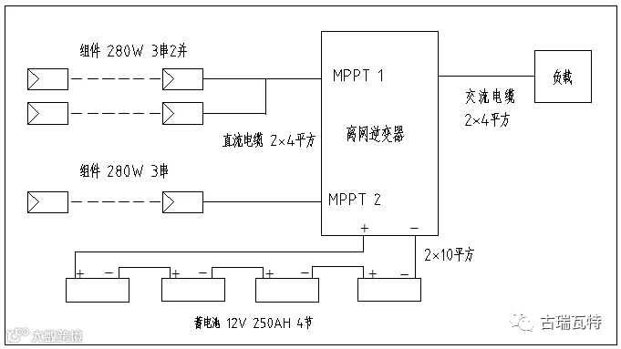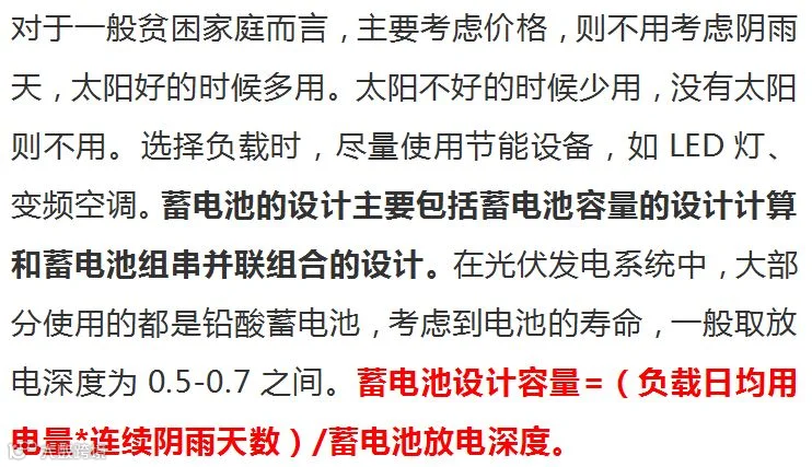 户用的电器大部分都是在晚上用,白天可能只有20%左右,为了增加蓄电池的寿命,可以适当增加蓄电池的容量,每天充放电深度低,这个项目设计采用4节12V250AH的胶体铅酸蓄电池,总容量12000VAH,可利用的电量约8.4度,平均晚上用电6度电,放电深度约50%。