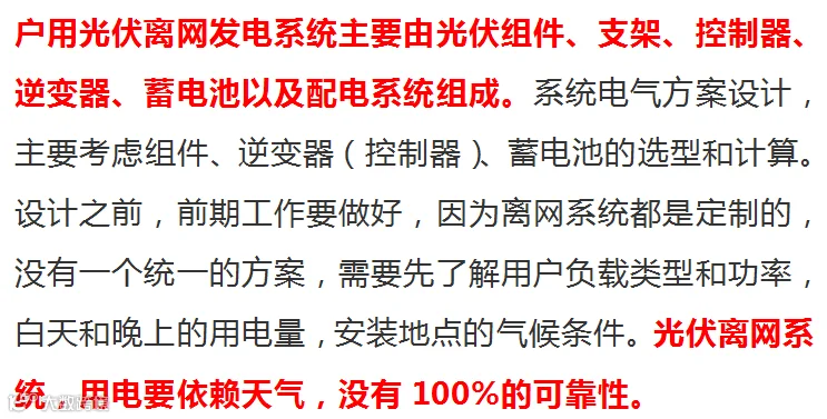 离网系统由于必须配备蓄电池,且占据了发电系统30-50%的成本。而且铅酸蓄电池的使用寿命一般都在3-5年,过后又得更换,从经济性来说,很难得到大范围的推广使用,只适合缺电的地方使用。