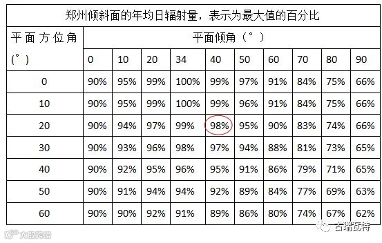 以河南郑州为例,地位经纬度为北纬36°,东经116°。下图给出不同朝向倾角的发电量值,按照最佳倾角最佳发电量的百分比表示。