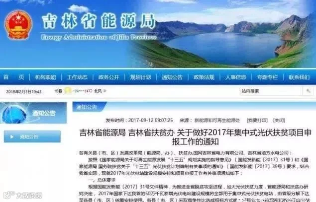 吉林省能源局、吉林省扶贫办下达《2017年光伏扶贫项目计划通知》。