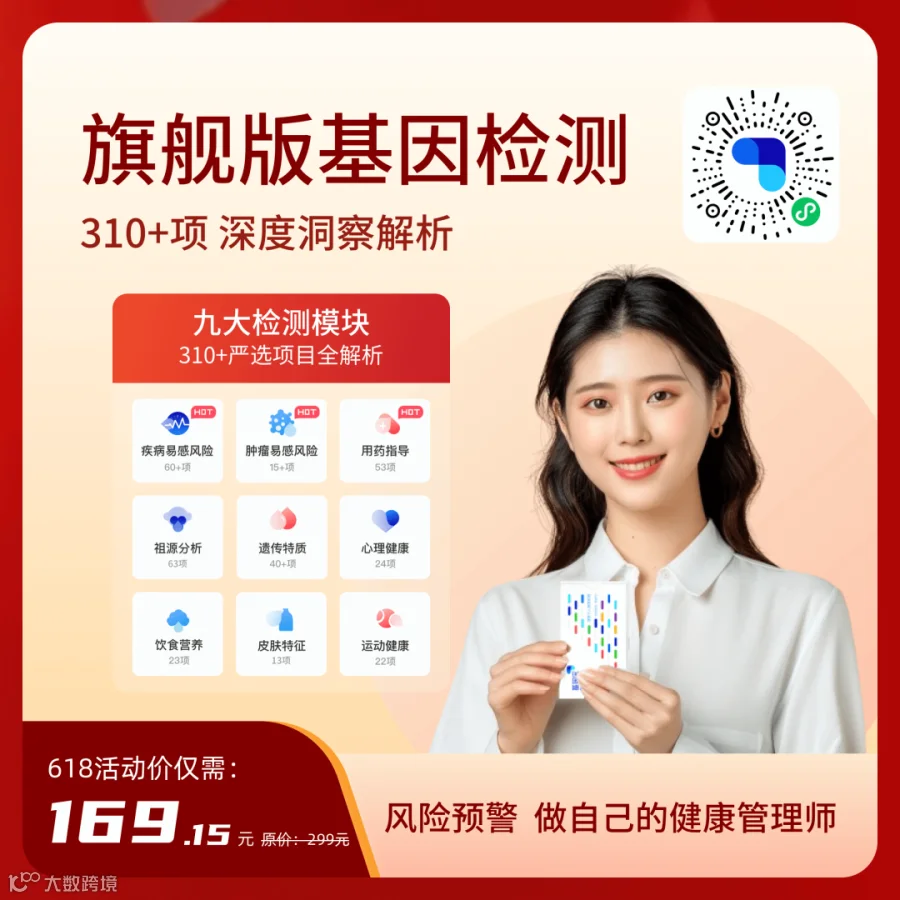 包含祖源、遗传特质、心理健康、饮食营养、皮肤特征、运动健康、疾病易感风险、肿瘤易感风险、用药指导9大板块,共310+项目全解析,每个人都可以做自己的“健康管理师”。