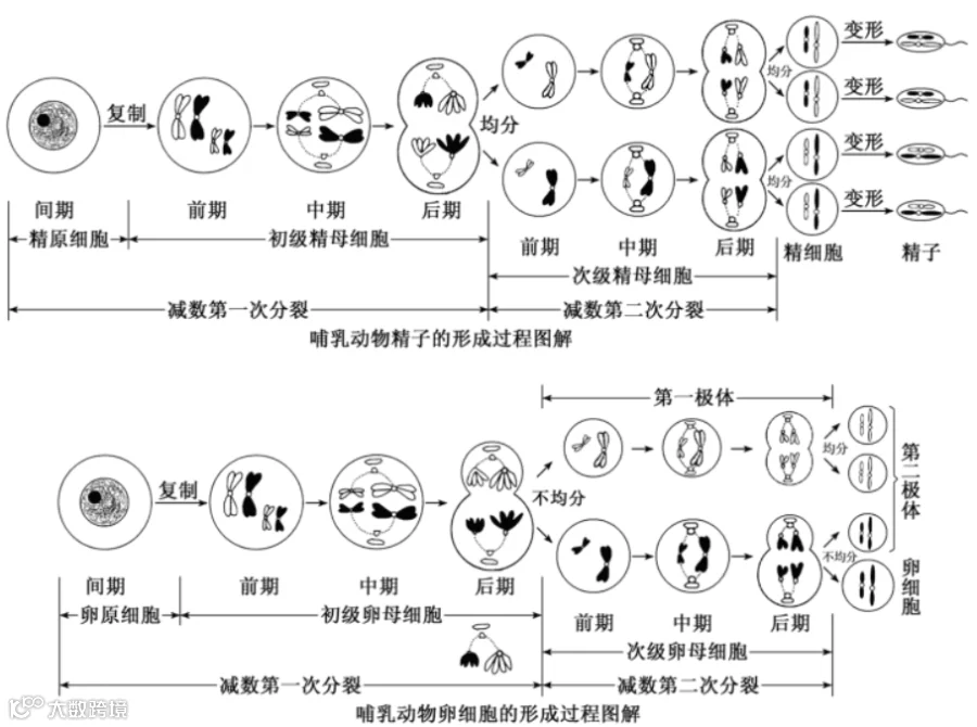 女性的性染色体为XX,而男性的为XY。男性的精原细胞在减数分裂的过程,XY染色体就会彼此分开,这样就产生了两种类型的生殖细胞(精子),每种中含有原来同源染色体的一半,要么是X,要么是Y。而女性的性染色体为XX,产生的卵子中就只携带X染色体。