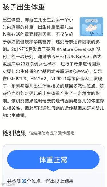 虽然我们不能操控孩子的性别,但孩子出生时的体重则受母亲遗传因素的影响。2019年发表在《Nature Genetics》上的一篇研究就发现母亲的一些多态性位点可能与婴儿的出生体重有关,因此可以检测母亲的这些多态性位点来评估婴儿的出生体重,快打开基因宝【微解读】看看你的遗传因素对孩子出生体重的影响吧。