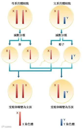 当携带Y型性染色体的精子(以下简称[Y型精子])与卵细胞结合,后代即为男孩;携带X型性染色体的精子(以下简称[X型精子])与卵细胞结合,后代则为女孩。