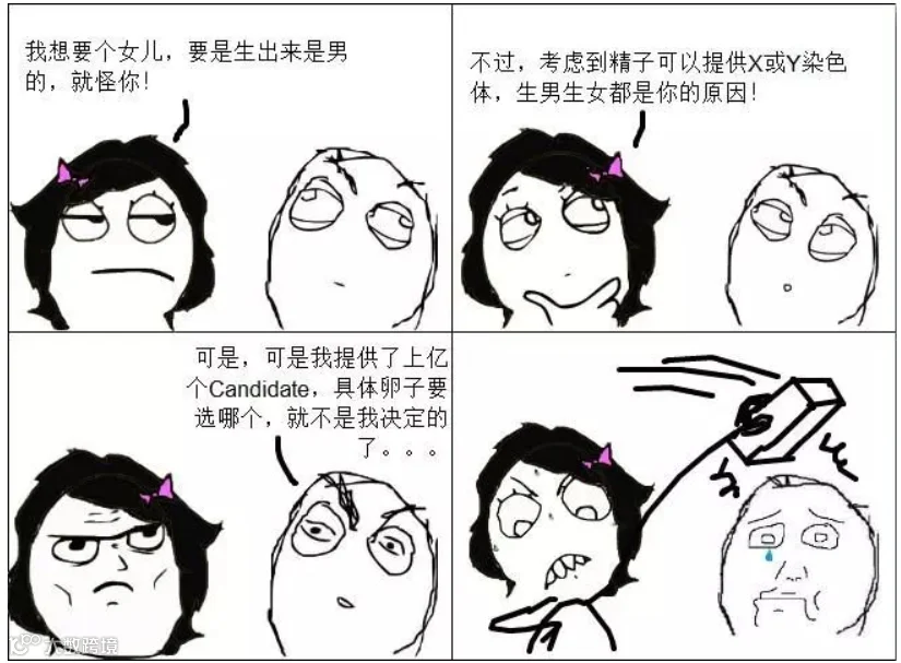 而X型精子和Y型精子的数量相等,受精概率基本上各为50%。所以只要上过高中的都清楚,生不出男孩都是女人肚子不争气的说法,从来都是无稽之谈。