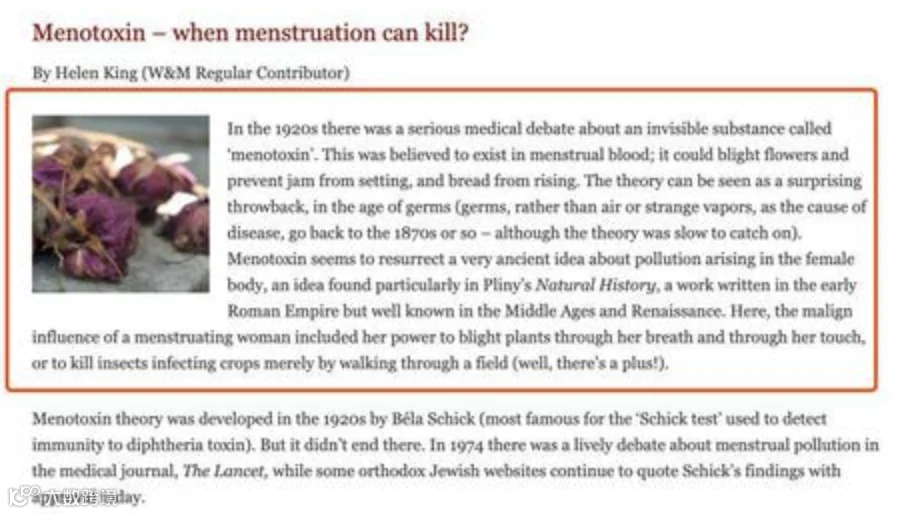 最早在1920年,儿科医生Béla Schick提出了所谓“月经毒素”(Menotoxin)的概念。他认为女性的经血中含有月经毒素,这种毒素会随着经血排出。他宣称经期女性的手触碰过的花很快会枯萎,就是因为月经毒素所致。