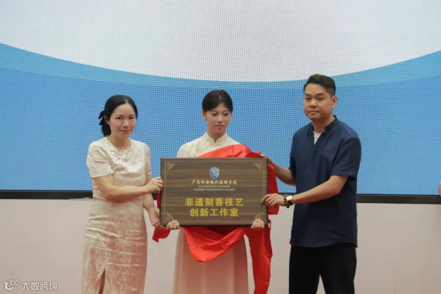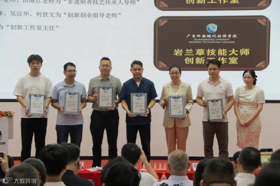 为表彰项目团队的努力,现场举行了授牌仪式。吴小娜主任为夏汉平教授授予“岩兰草技能大师”聘书,为谢利丰老师、田维红老师(沉香商学院院长)授予“非遗制香技艺传承人导师”聘书,为曾令泽、吴汉华(广州茗莎生物)、何世文(广州合盛化妆品)授予“创新创业指导老师”聘书,为顾白授予“创新工作室主任”聘书。这些聘书不仅是荣誉,更是推动项目发展的责任与使命。