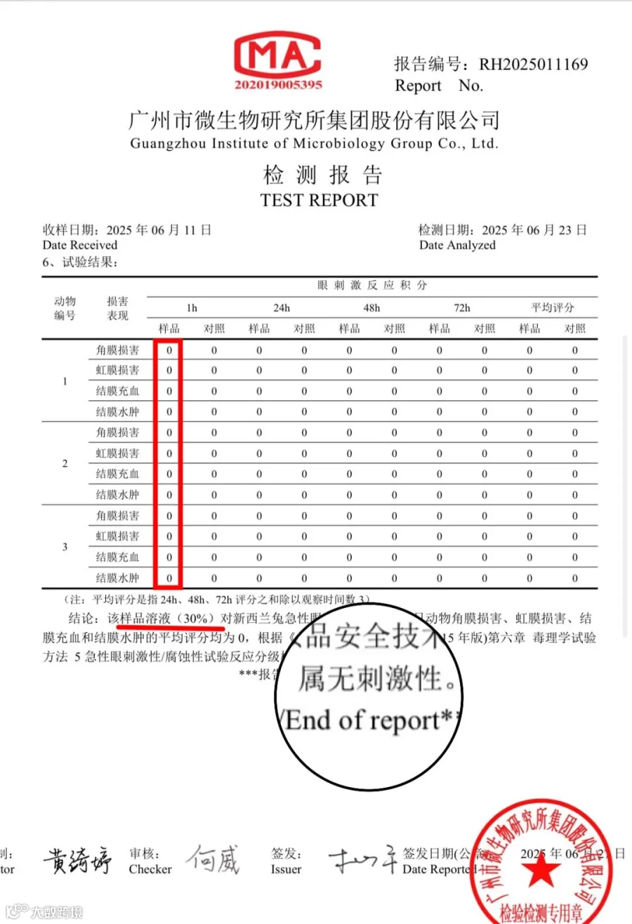 将样品稀释成30%浓度按照《化妆品安全技术规范》(2015年版)第六章毒理学实验方法进行急性眼刺激测试。