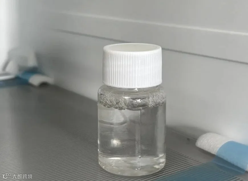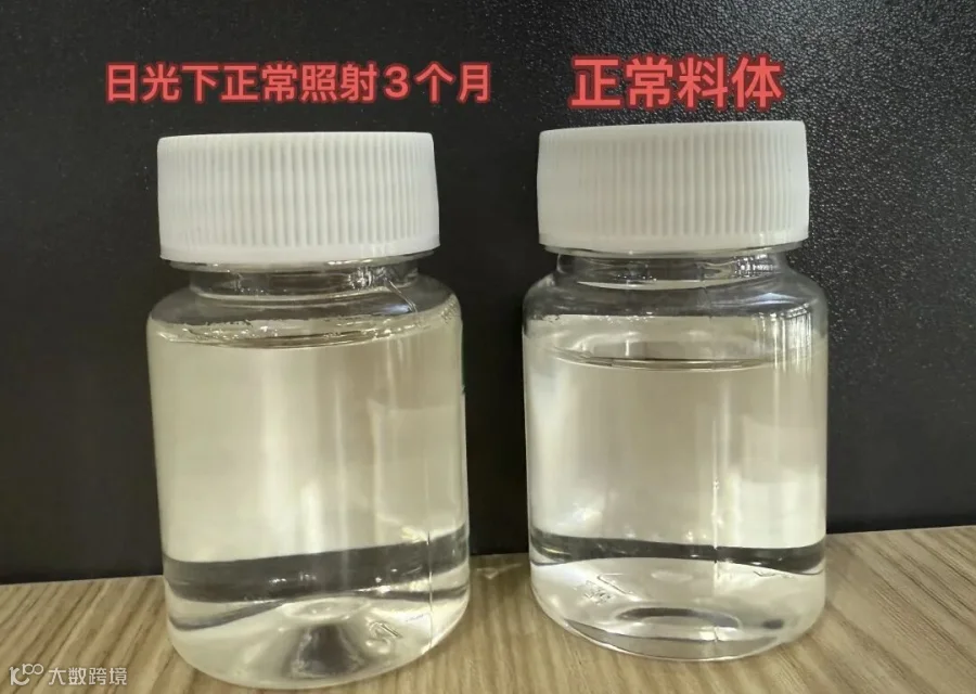将样品装进样板瓶中,进行日光照射测试3个月,测试后料体与正常料体对比,无明显变化,基本不黄变。