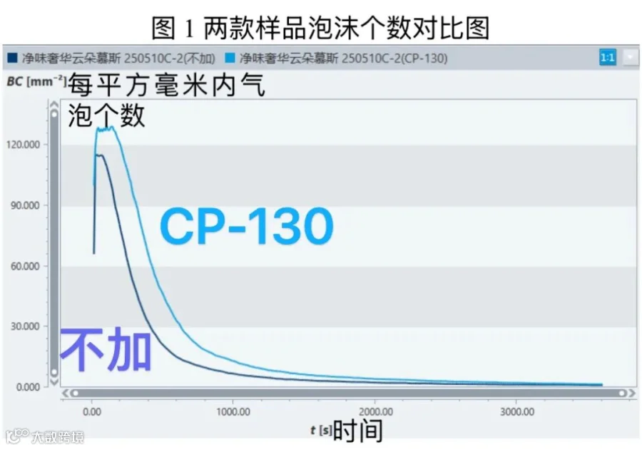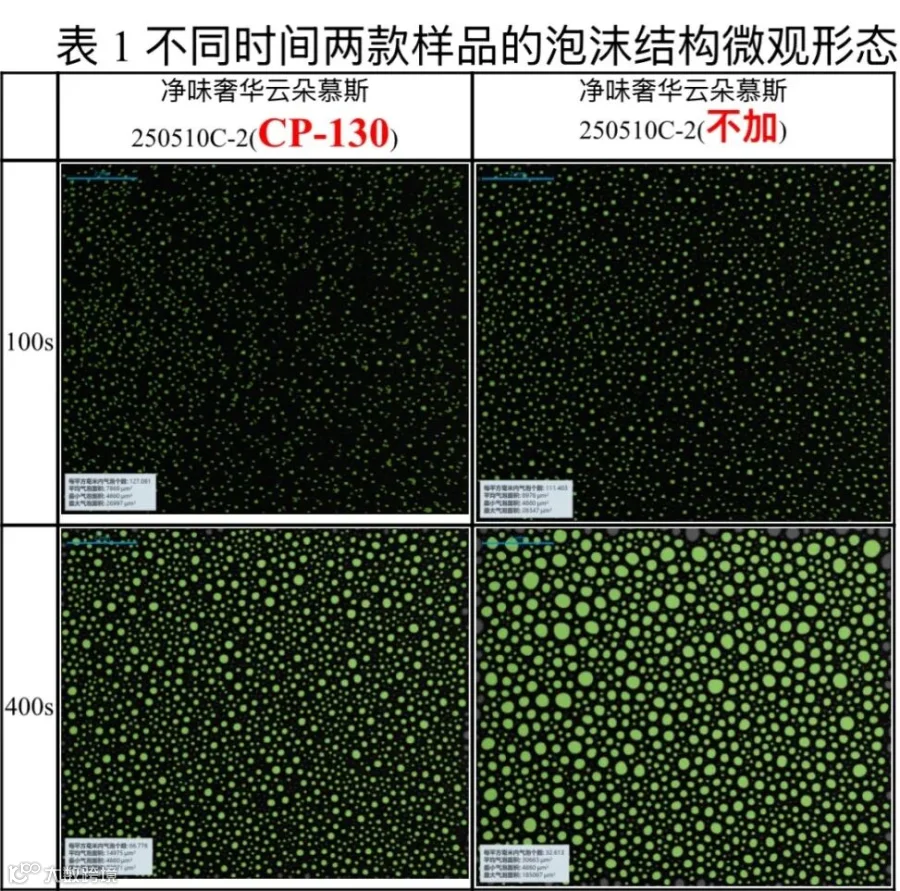 结论:加了CP-130的配方平方毫米内气泡个数泡沫更多,泡沫丰富度跟绵密度更佳。