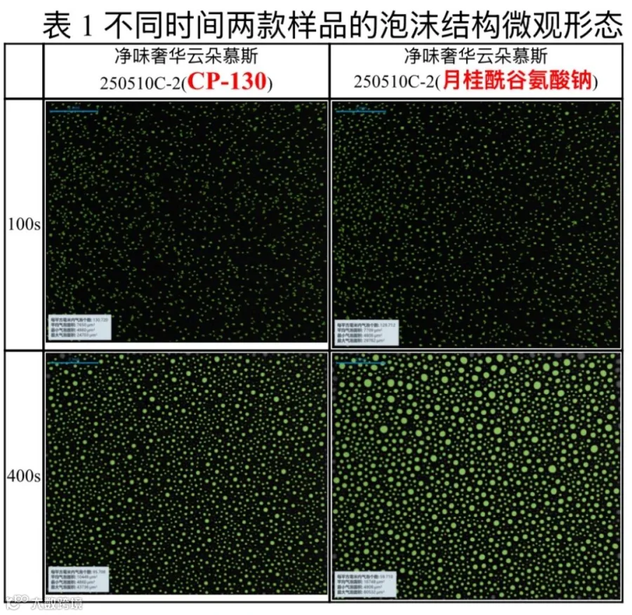 结论:加了CP-130的配方比加月桂酰谷氨酸钠的配方平方毫米内气泡个数泡沫更多,泡沫丰富度跟绵密度更佳。