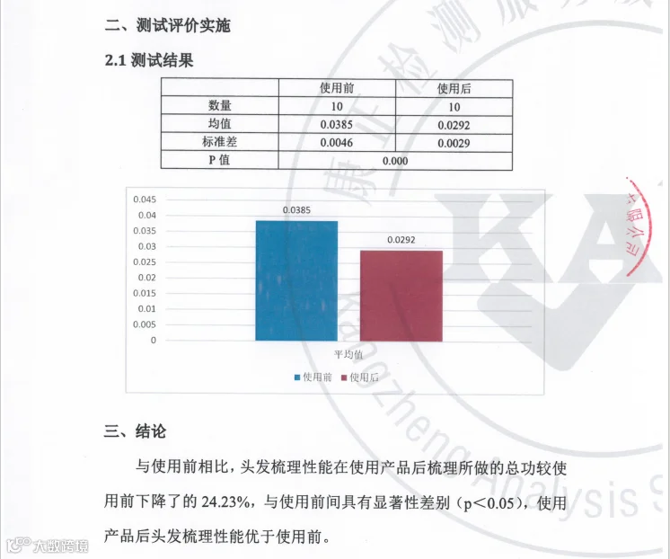 实验结论表明:与使用前相比,头发梳理性能在使用产品后梳理所做的总工较使用前下降了24.23%,与使用前间具有显著性差别(p<0.05),使用产品后头发梳理性能优于使用前。