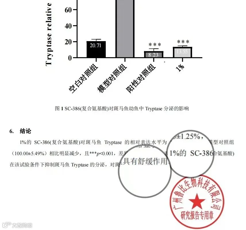 实验结论表明:1%的SC-386(复合氨基酸)对斑马鱼类胰蛋白酶(Tryptase)的相对表达水平为13.55±1.25%,与模型对照组(100.00±5.49%)相比明显减少,且***p<0.001,差异(非常显著),表示1%的SC-386(复合氨基酸)在改实验条件下抑制斑马鱼类胰蛋白酶(Tryptase)的分泌,对斑马鱼具有舒缓作用。