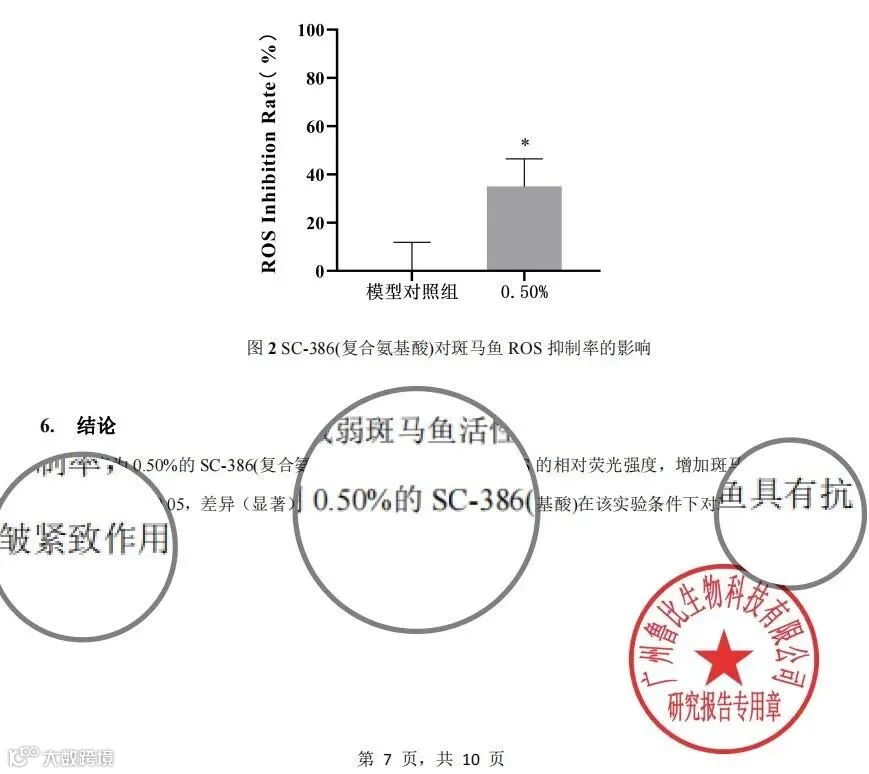 实验结论表明:浓度为5%的SC-386(复合氨基酸)减弱斑马鱼活性氧ROS的相对荧光强度,增加斑马鱼ROS的抑制率,且*p<0.05,差异(显著),说明0.50%的SC-386(复合氨基酸)在该实验条件下对斑马鱼具有抗皱紧致作用。