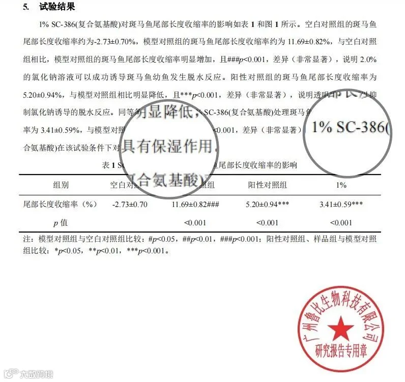 实验结果显示:1%SC-386(复合氨基酸)对斑马鱼尾部长度收缩率为3.41±0.59%,与模型对照组(11.69±0.82%)相比明显下降,且***p<0.001,差异(非常显著),表示1%SC-386(复合氨基酸)在该实验条件下对斑马鱼具有保湿作用。