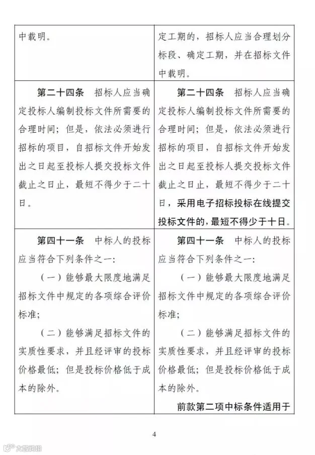 以下是《招投标法》和《招投标实施条例》修改前后对照表: