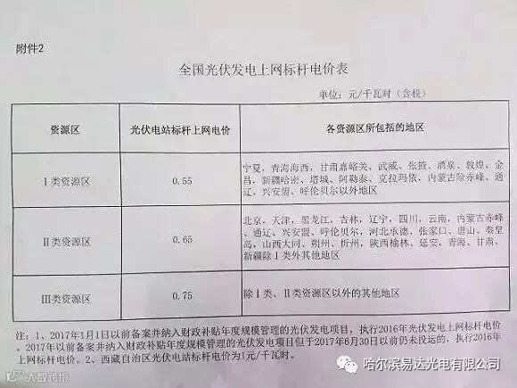 该文件显示,2017年光伏上网标杆电价已确定为一类资源区0.6元/KWh、二类资源区0.7元/KWh、三类资源区0.8元/KWh,目前正在走会签流程,将于不久后正式下发。发改委相关负责人向记者回应称,以正式文件出台为准。