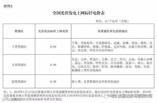 2016年光伏标杆上网电价
